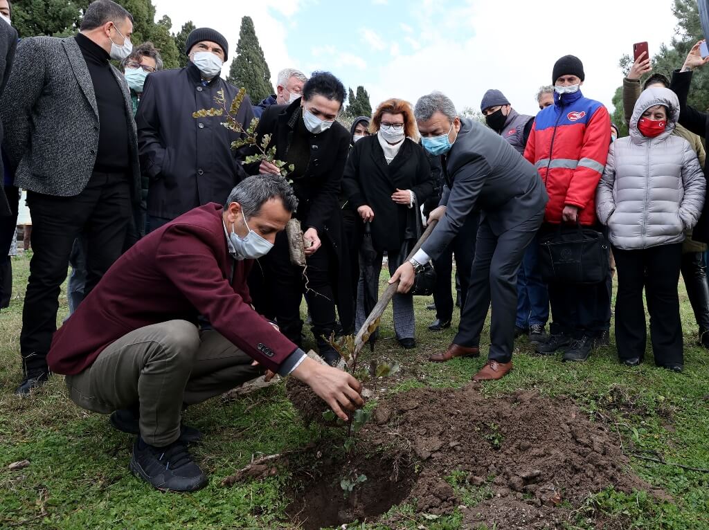 Fidan dağıtımı yapılmadan önce bölgeye protokol üyeleri ve vatandaşlar tarafından keçiboynuzu fidanı dikildi.