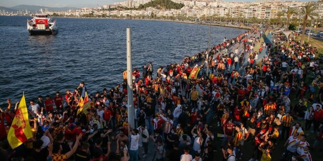 Sarı-kırmızılı taraftar grupları, gün içinde özellikle sosyal medya üzerinden koordine olup Mustafa Kemal Sahil Bulvarı’na geldi ve burada meşale yakılıp, havai fişek gösterisi yapıldı.