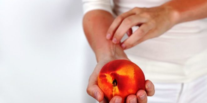Meyve alerjileri nadir görülmekle birlikte, bunlar içerisinde şeftali alerjisi en sık bilinendir. Genellikle şeftali tükettikten hemen sonra ilk 2 saatte reaksiyon oluşur. Nadiren şeftali kokusu ile veya cilde teması sonrası da reaksiyon görülebilmektedir. En sık görülen şikayetler ağızda kaşıntı ve karıncalanma, ciltte döküntü, kaşıntı, yüzde-gözde şişme, kusma, ishal, burun akıntısı, hapşırık, burun tıkanıklığı, öksürük, hışıltı, nefes darlığıdır. Ancak, alerjik şoka yol açıp hayatı tehdit de edebilir.