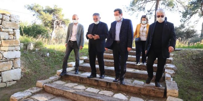 Linyit madeni sahasından çıkarılıp arkeopark alanına taşınan anıtsal mezar türlerini, tarihi zeytinyağı işliğini inceleyen Tavlı, Milas Müze Müdürü Mehmet Çelebi’den kültür varlıkları hakkında bilgi aldı.