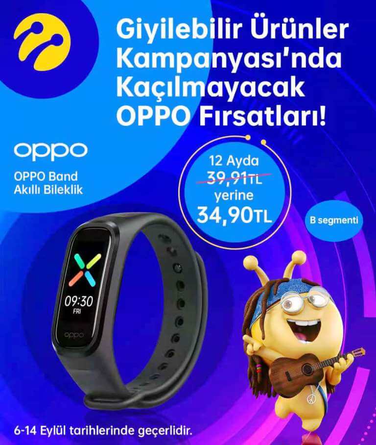 Dünyanın önde gelen lider akıllı ürün markası OPPO’nun uykunun her saniyesinde aktif olarak kandaki oksijen (SpO2) değerini ölçen ve 1.1 inç tam renkli AMOLED ekranıyla tasarım estetiğini koruyan OPPO Band akıllı bilekliği Turkcell mağazalarında Giyilebilir Ürünler kampanyasında indirimli fiyatıyla tüketiciyle buluşuyor. 14 Eylül’e kadar devam edecek kampanya kapsamında tüketiciler taksitli ödemeyi seçtiklerinde OPPO Band’e indirimli fiyatı üzerinden sahip olabiliyorlar. OPPO’nun akıllı bilekliği OPPO Band 12 aylık taksitli ödeme planında aylık 39,91 TL yerine 34,90 TL üzerinden satışa sunuluyor.